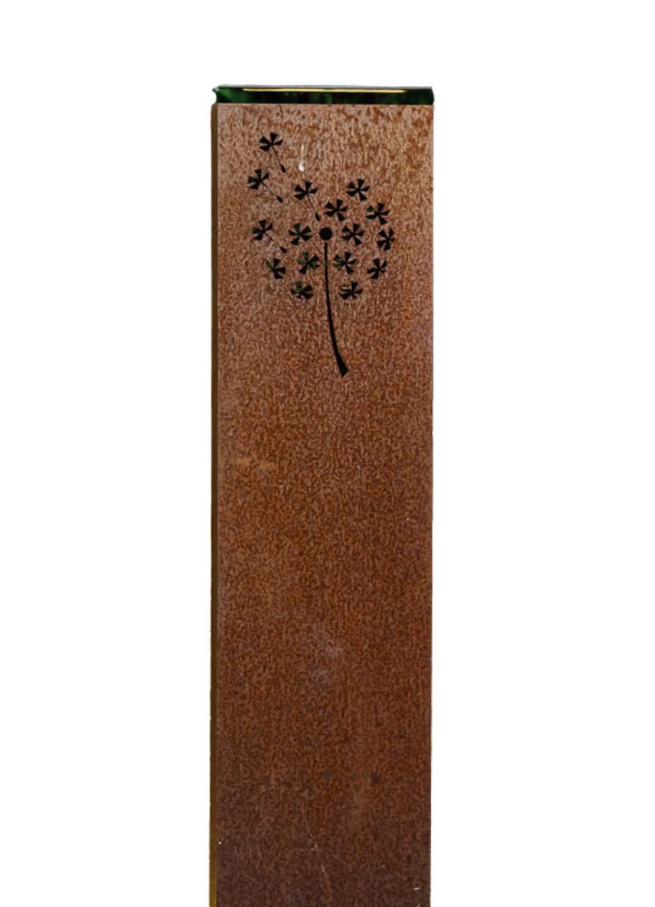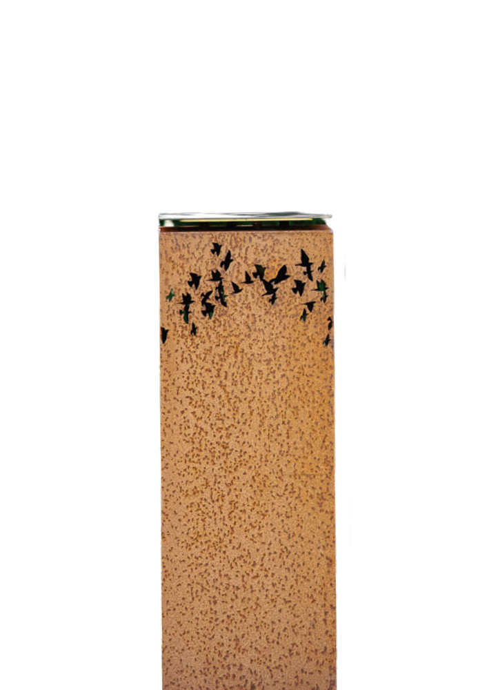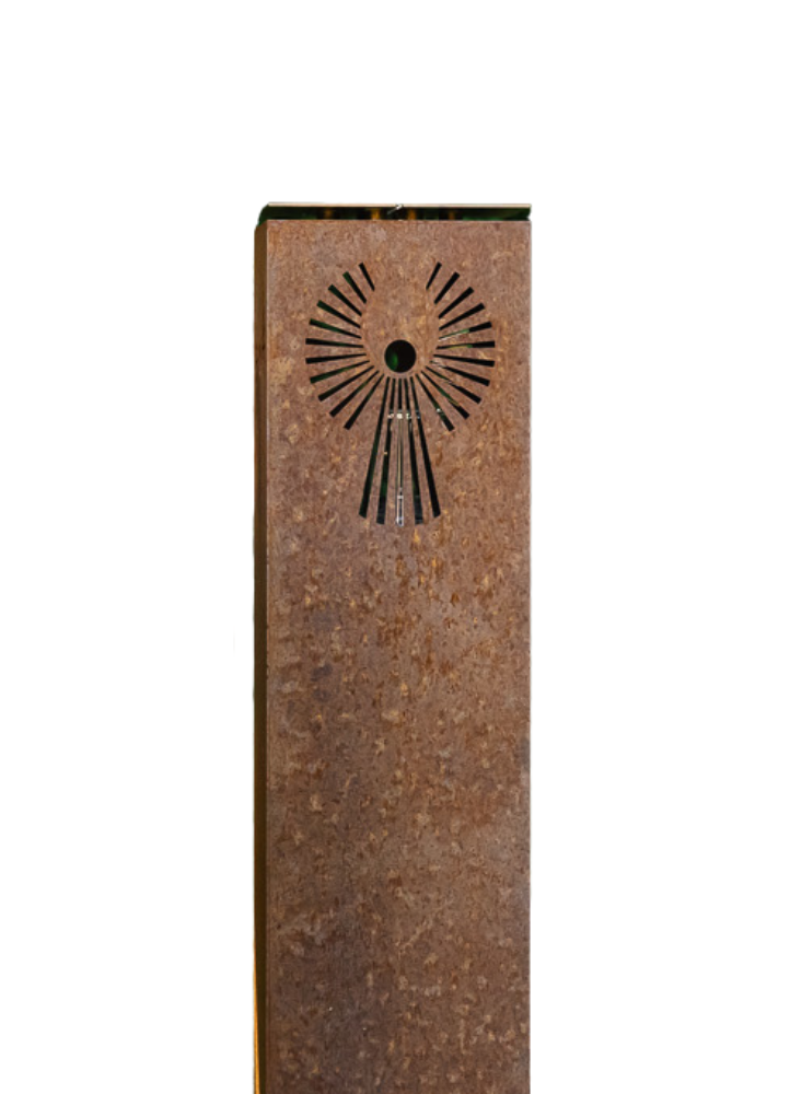 Denne mindelanterne er 105 cm høj og fremstillet i holdbart cortenstål, som med tiden får en smuk, rustfarvet overflade. Lanterne kan vælges med 4 forskellige motiver og er velegnet til gravsted eller mindested, hvor den står stabilt og giver et roligt lys.