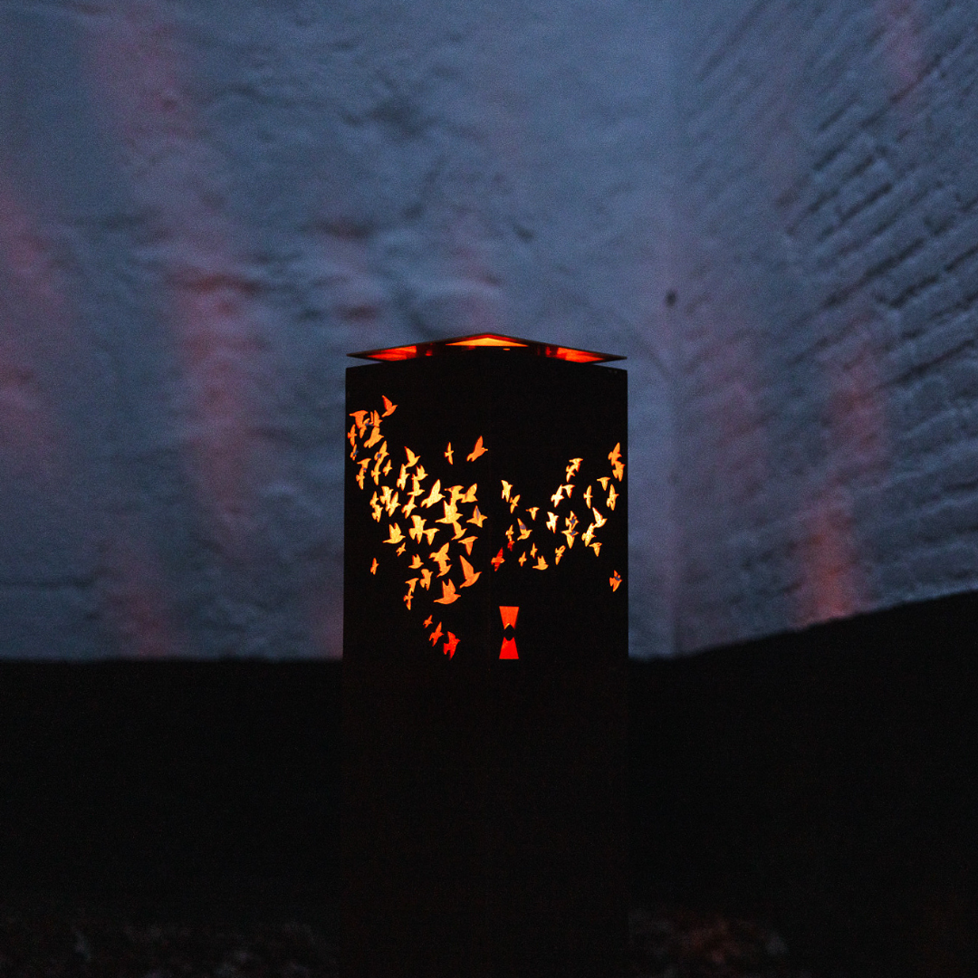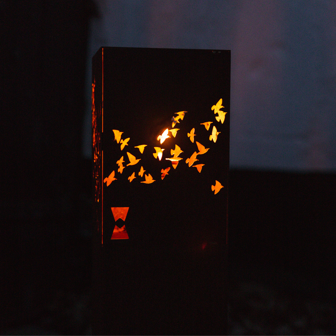 De udskårne motiver lader lyset skinne ud og skaber et roligt og synligt mindelys. Lanternen er udviklet og designet i Danmark og produceres lokalt.