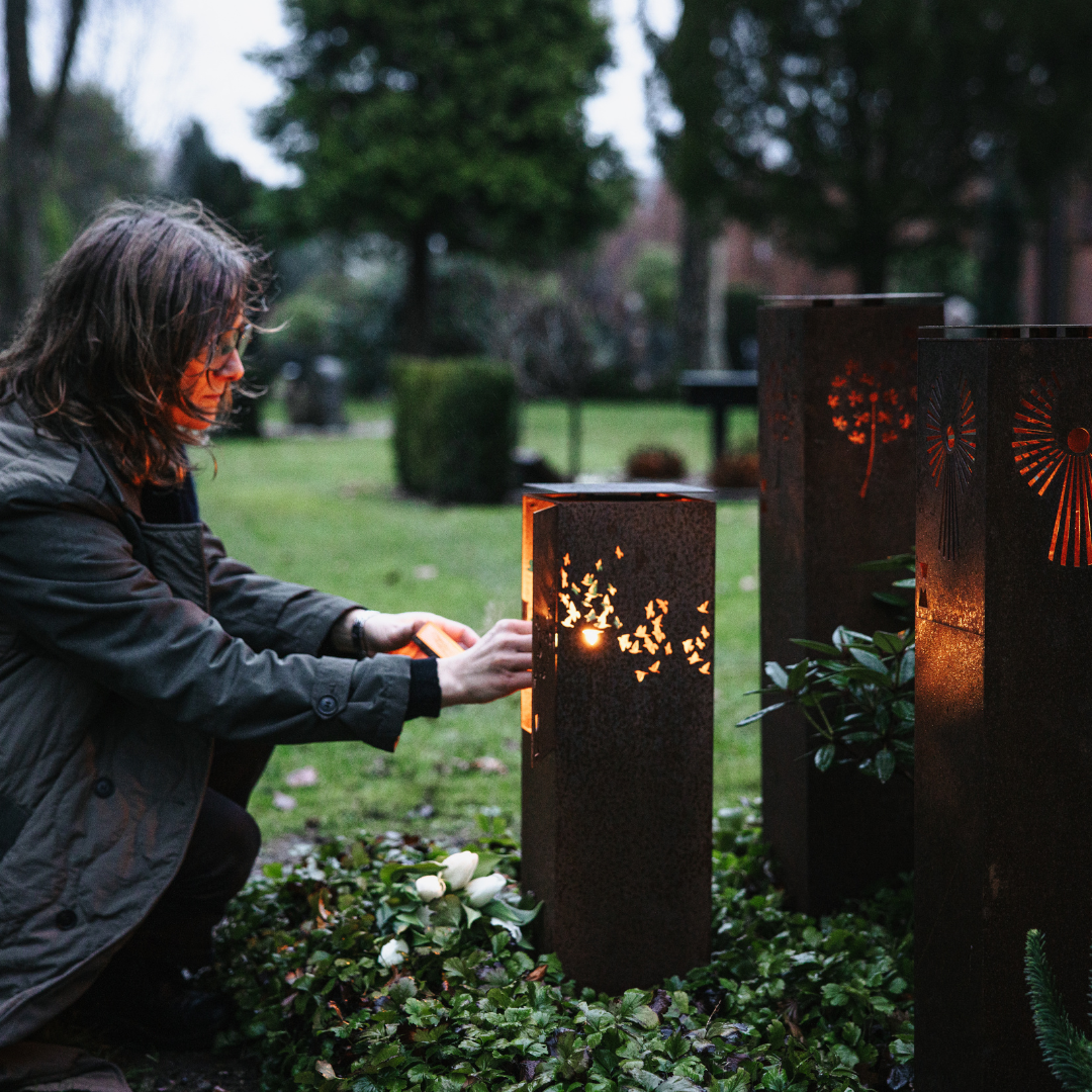 Mindelanternen fås i forskellige motiver og højder samt med mulighed for personlig navneplade.